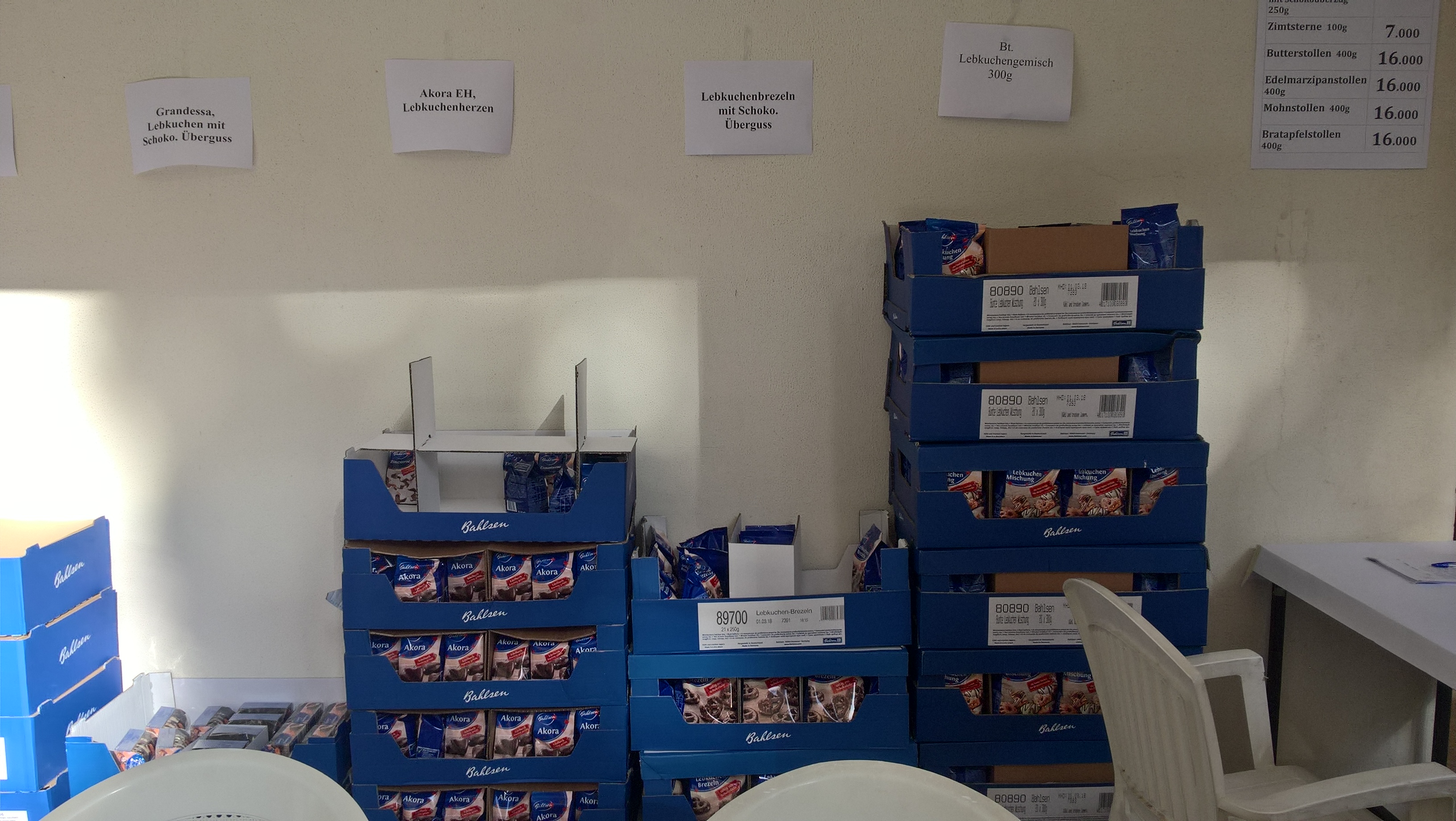 Am Basartag habe ich für einige Stunden im Obergeschoss des Gemeindehauses Essens- und Getränkebons verkauft. Diese konnten dann von den Käufern gegen Kuchen, Torten, Quarkbällchen, Kartoffelsalat, Sauerkraut, heiße Würstchen, Bier, Glühwein, Kaffee, Tee oder Softdrinks eingetauscht werden.