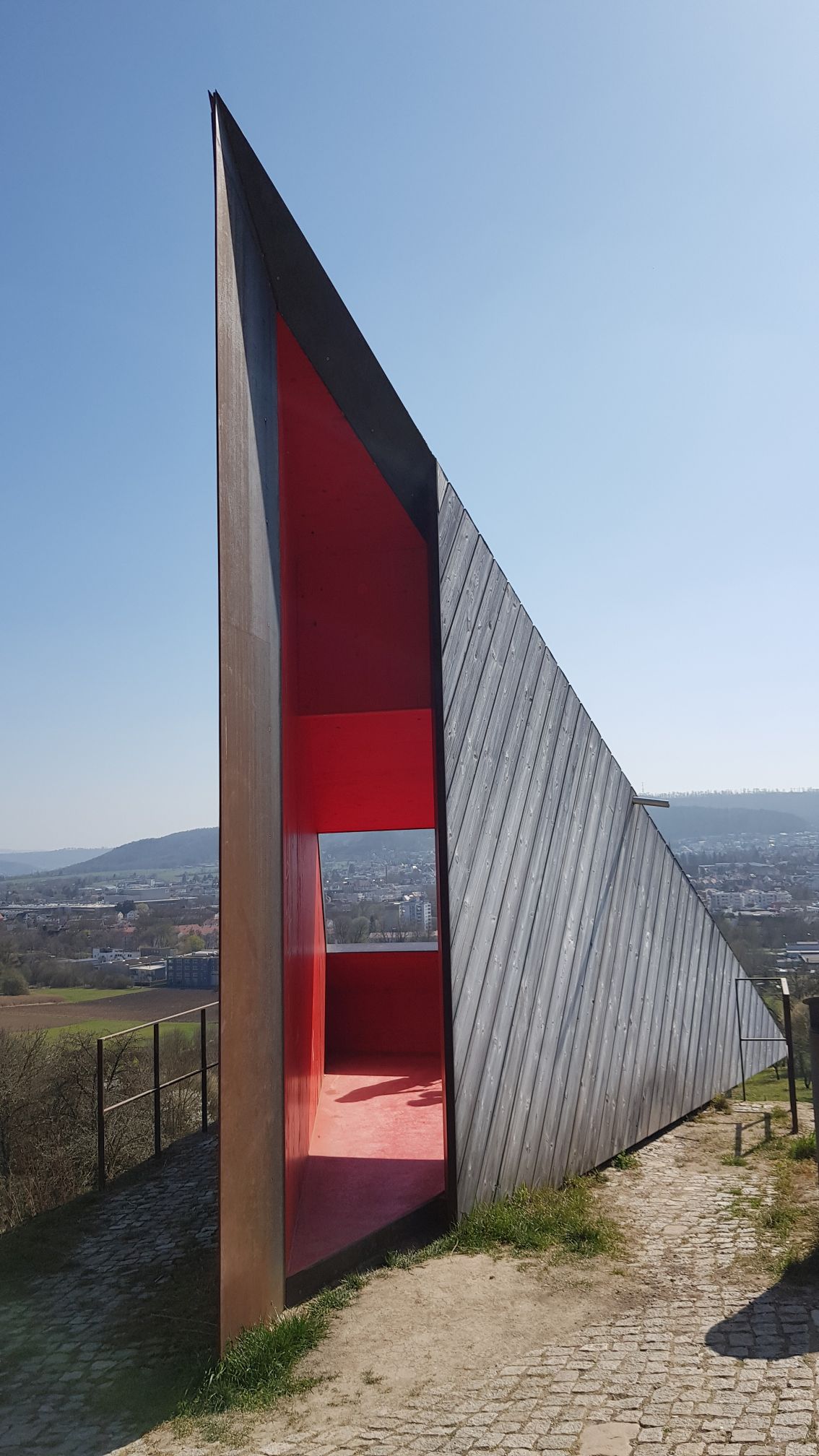 Die tetraederförmige Raumskulptur, die von den Architekten schneider+schumacher aus Frankfurt für die Stadt Schorndorf entwickelt wurde, entsteht mitten in den Weinreben am Grafenberg. Das Prisma nimmt zwei entgegengesetzte Bezüge zur Landschaft auf: Die vertikale Öffnung orientiert sich zum Tal mit Blickausrichtung zur Schorndorfer Kirche. Die horizontale Öffnung orientiert sich zum Hang, zum Wald und zum Wanderweg. Der begehbare Ort lädt zum Entdecken, Verweilen und Fernblicken ein. Einige der 15 weiteren Stationen zur Remstal Gartenschau 2019 können von hier oben entdeckt werden.